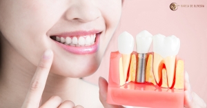 Um pino de titânio é colocado dentro do osso, abaixo da gengiva e que tem a função de fazer o mesmo papel da raiz do dente. Em cima do implante é que o cirurgião dentista coloca o novo dente.